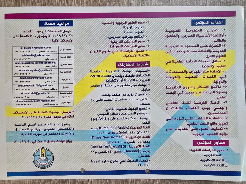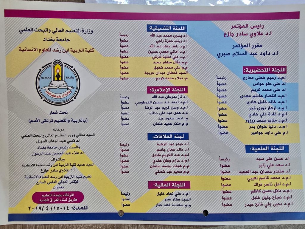 أقامت كلية التربية ابن رشد للعلوم الانسانية مؤتمرها العلمي الدولي السابع بعنوان (الارتقاء بجودة التعليم طريق لبناء العراق الجديد) وتحت شعار بالتربية والتعليم ترتقي الامم للفترة 14-15/4/2019 شارك فيه باحثين من مختلف الجامعات العراقية والعالمية .