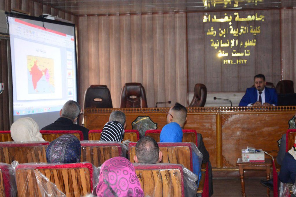 نظم قسم الجغرافي بالاشتراك مع قسم التاريخ في كلية التربية ابن رشد للعلوم الإنسانية ندوة عن التعايش السلمي بين الاديان الهند انموذجاً والذي القاها الدكتور احمد خميس حمادي والدكتورة زينة حارث جرجيس .