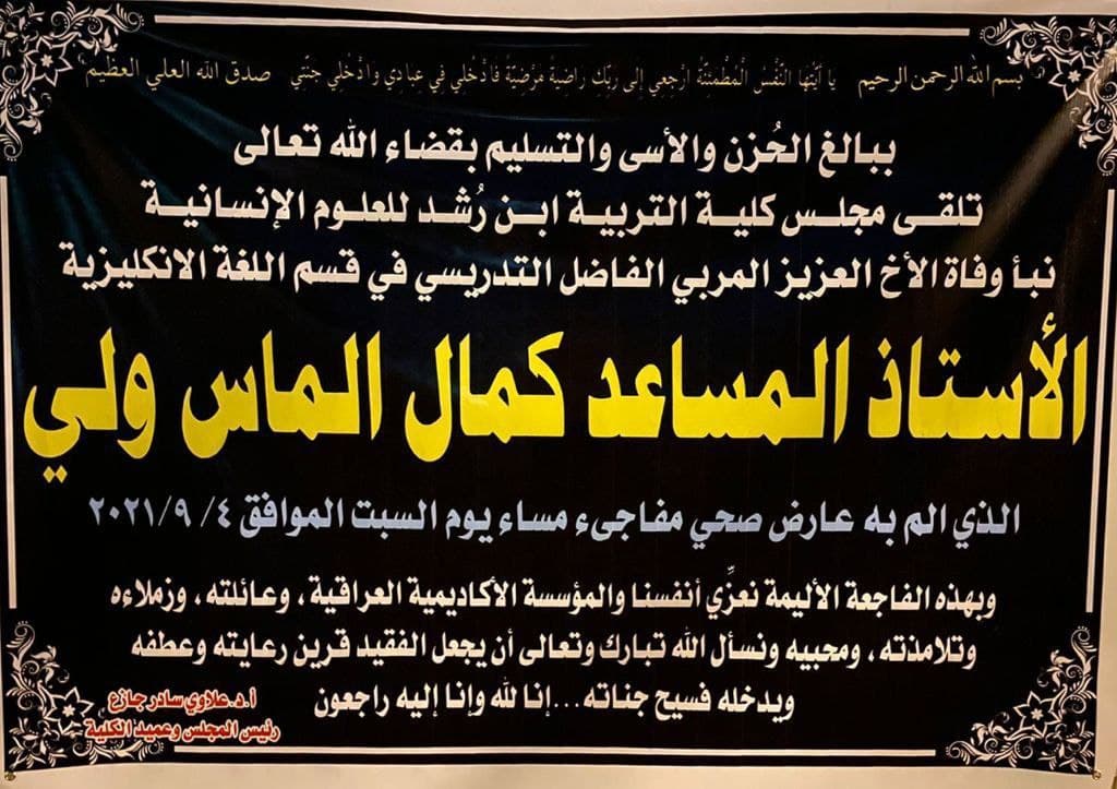 بسم الله الرحمن الرحيم(( يَا أَيَّتُهَا النَّفْسُ الْمُطْمَئِنَّةُ ارْجِعِي إِلَى رَبِّكِ رَاضِيَةً مَرْضِيَّةً فَادْخُلِي فِي عِبَادِي وَادْخُلِي جَنَّتِي )) صدق الله العلي العظيم ببالغ الحُزن والأسى والتسليم بقضاء الله تعالى تلقى مجلس كلية التربية ابن رُشد للعلوم الإنسانية مساء هذا اليوم السبت الموافق ٤ / ٩ / ٢٠٢١ نبأ وفاة الأخ العزيز، والمربي الفاضل التدريسي في قسم اللغة الانكليزية( أ.م. كمال الماس ولي)، وبهذه الفاجعة الأليمة نعزِّي أنفسنا والمؤسسة الأكاديمية العراقية، وعائلته، وزملاءه، وتلامذته، ومحبيه ونسأل الله تبارك وتعالى أن يجعل الفقيد قرين رعايته وعطفه، ويدخله فسيح جناته… إنا لله وإنا إليه راجعون .