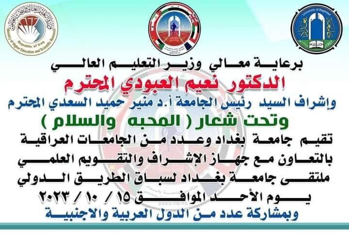 برعاية معالي وزير التعليم العالي والبحث العلمي الدكتور نعيم العبودي المحترم وبإشراف رئيس جامعة بغداد الأستاذ الدكتور منير حميد السعدي المحترم، وتحت شعار ( المحبَّة والسلام ) شاركت كليتنا ممثلة بالسيد معاون العميد للشؤون الإدارية الأستاذ الدكتور أحمد عبد حسين الفرطوسي ممثلاً عن السيد العميد بفعاليات انطلاق سباق الطريق الدولي الذي أقيم صباح هذا اليوم الأحد الموافق ١٥ / ١٠ / ٢٠٢٣ بالتعاون مع جهاز الإشراف والتقويم العالي، وقد شارك فيه عدد من الدول العربية والأجنبية وبحضور عالي المستوى، وتمَّ تقديم الهدايا والجوائز الثمينة وتوزيعها على الفائزين