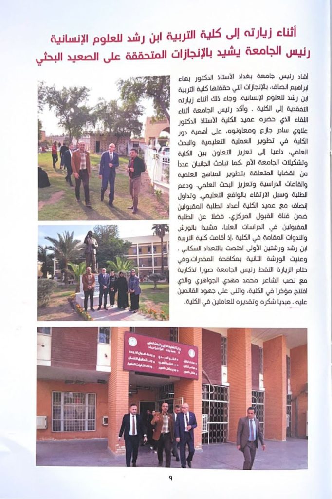 نشرت مجلة صدى جامعة بغداد (في العدد 51 لشهر كانون الثاني 2025 في الصفحة التاسعة) خبر زيارة رئيس جامعة بغداد الاستاذ الدكتور بهاء ابراهيم انصاف الى كلية التربية ابن رشد للعلوم الانسانية والذي اكد خلال زيارته على اهمية دور الكلية في تطوير العملية التعليمية والبحث العلمي, داعيا الى تعزيز التعاون بين الكلية وتشكيلات الجامعة الام واثنى على جهود القائمين مبديا شكره وتقديره للعاملين في الكلية.