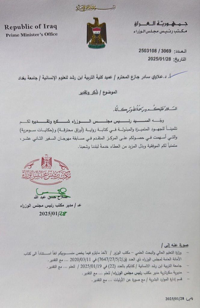 وجه دولة رئيس مجلس الوزراء السيد محمد شياع السوداني بمنح كتاب شكر وتقدير الى عميد كلية التربية ابن رشد للعلوم الانسانية الاستاذ الدكتور علاوي سادر جازع تثمينا للجهود المتميزة في كتابة رواية ( اوراق محترقة ) و ( حكايات سومرية ) والتي حصد من خلالها المركز المتقدم في مسابقة مهرجان السفير الثاني عشر , متمنيا له المزيد من العطاء خدمة لبلدنا وشعبنا العظيم .