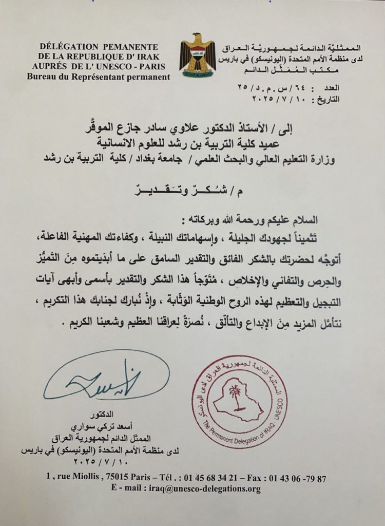مُنح السيد عميد كلية التربية ابن رشد الاستاذ الدكتور علاوي سادر جازع المحترم كتاب شكر وتقدير من الممثلية الدائمة لجمهورية العراق لدى منظمة الامم المتحدة (اليونيسكو) في باريس الدكتور اسعد تركي سواري.