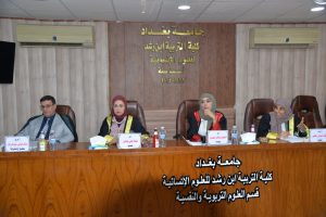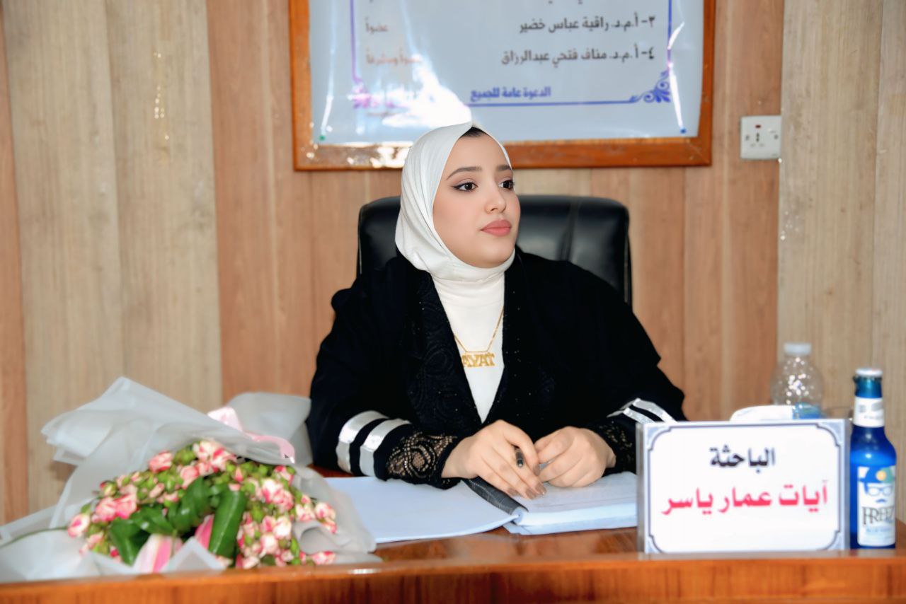 جرت في كلية التربية ابن رشد للعلوم الانسانية بجامعة بغداد مناقشة رسالة الماجستير بعنوان (تطـور آليات الدفـاع النفـسي عـند الأطفـال ) ,للباحثة من قسم العلوم التربوية والنفسية (آيات عمـار ياسـر) تخصص علم نفس النمو, و تألفت لجنة المناقشة من الاستاذ الدكتور انتصار هاشم مهدي رئيسا ,والاستاذ المساعد الدكتور مناف فتحي عبدالرزاق عضوا ومشرفا ,والاستاذ الدكتور غادة علي هادي عضوا , مع الاستاذ المساعد الدكتور راقية عباس خضير بصفته عضوا خارجيا من كلية التربية الاساسية / جامعة بابل.