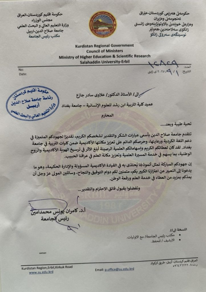 استقبل السيد عميد كلية التربية ابن رشد للعلوم الانسانية الاستاذ الدكتور علاوي سادر جازع وفداً من جامعة صلاح الدين في اربيل الاربعاء ٢٠٢٥/٩/٣، الذي قدم له كتاب شكر وتقدير ودرع الابداع والتميز من قبل رئيس جامعة صلاح الدين الاستاذ الدكتور كامران يونس محمد امين تكريماً لجهوده العلمية والادارية ودعمه المستمر لمسيرة التعليم العالي على نحو عام والاهتمام بقسم اللغة الكردية على نحو خاص .