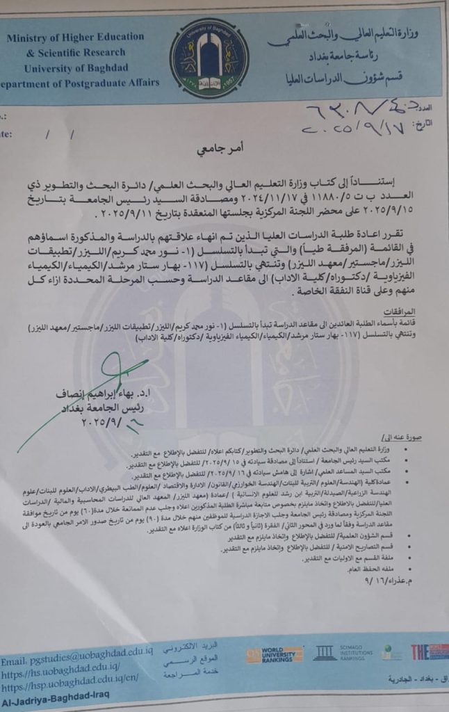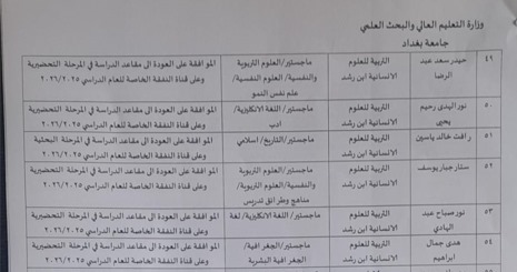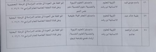 يسر كلية التربية ابن رشد للعلوم الانسانية ان تعلن عبر موقعها الالكتروني وباشراف السيدة معاون العميد للشؤون العلمية المحترمة الاستاذ الدكتورة ازهار نوري فجر الامر الجامعي لاعادة طلبة الدراسات العليا للعام الدراسي 2025-2026 الذين تم انهاء علاقتهم بالدراسة والمذكورة اسماؤهم في القائمة المرفقة مع اطيب الامنيات لطلبتنا الاعزاء بدوام الموفقية والنجاح خدمة لعراقنا العزيز .