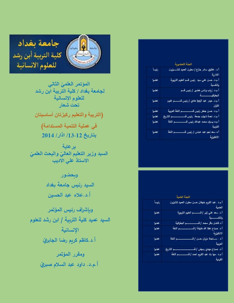 برعاية معالي وزير التعليم العالي والبحث العلمي الأستاذ علي الأديب، أقامت كلية التربية للعلوم الإنسانية / ابن رشد – جامعة بغداد مؤتمرها العلمي الدولي الثاني على قاعة الكلية الرئيسة، للمدة من 12–13 آذار 2014، تحت شعار: