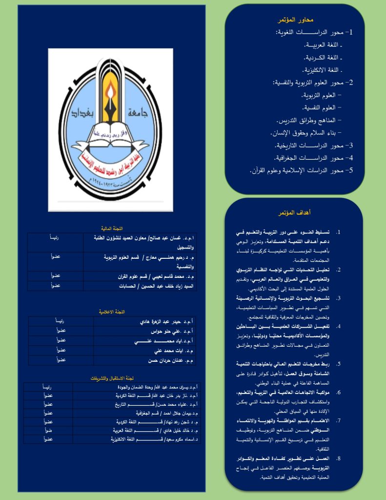 لقد جاء هذا المؤتمر تتويجًا لجهود كبيرة بُذلت من قبل اللجنة العلمية والتنظيمية في كليتنا، وإيمانًا منّا بضرورة فتح فضاءات علمية رحبة للحوار، وتبادل الخبرات، وعرض نتائج البحوث والدراسات التي تتناول قضايا التعليم والتربية من منظور أكاديمي وبُعد إنساني شامل، في إطار يواكب التحديات المعاصرة التي تواجه مجتمعاتنا.
