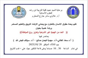 في إطار سعي كلية التربية ابن رشد للعلوم الإنسانية – قسم التاريخ إلى تعزيز الوعي الوطني وترسيخ قيم الانتماء لدى الطلبة، نظّمت وحدة حقوق الإنسان بالتعاون مع وحدتي الإرشاد التربوي والتعليم المستمر يوم الثلاثاء الموافق 28 تشرين الأول 2025، ورشة عمل بعنوان “الحد من الهجرة غير الشرعية وتعزيز روح المواطنة”، بحضور عدد من أساتذة القسم وطلبة الكلية من مختلف المراحل الدراسية.