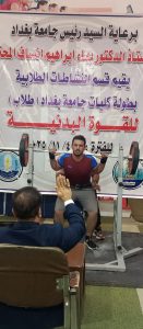 شاركت شعبة النشاطات الطلابية (الوحدة الرياضية) والمتمثلة بـ م.م حيدر حسين في كلية التربية ابن رشد للعلوم الانسانية بجامعة بغداد في بطولة كليات جامعة بغداد (طلاب) للقوة البدنية، والتي تقام برعاية واشراف اتحاد القوة البدنية وتنظيم قسم النشاطات الطلابية في الجامعة الام وبمشاركة كليات الجامعة كافة باستثناء كلية التربية.